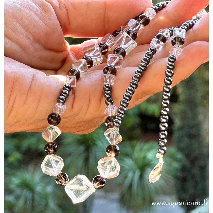 Découvrez "Trésor d'ancrage", une création exclusive d'Aquarienne qui marie l'éclat des pierres naturelles à leurs vertus énergétiques. Ce collier unique, composé de perles de cristal de roche taillées en cubes, de perles rondes d'hématite et de quartz fumé, se termine par un fermoir en plaqué argent 10 microns, symbole de finesse et de durabilité.