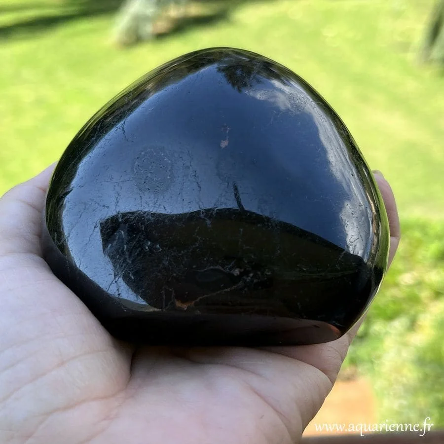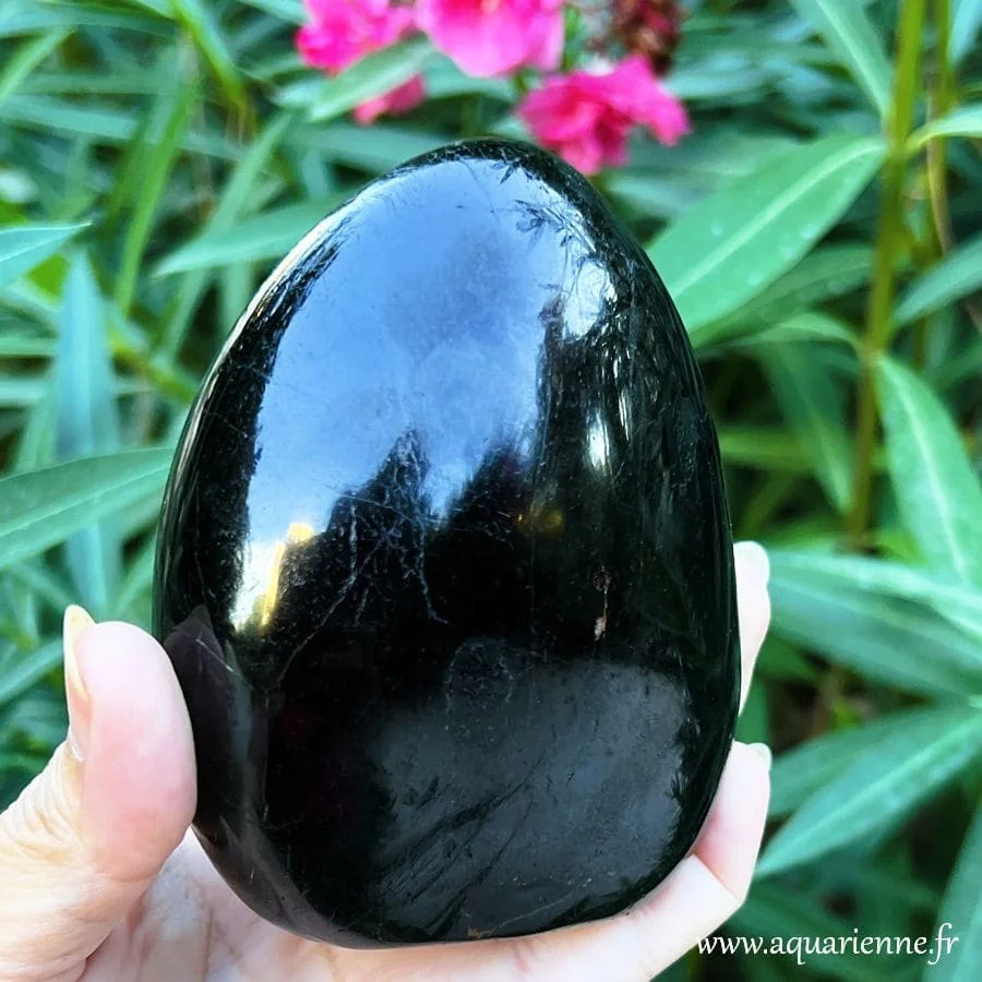 Avec une dureté de 7 à 7,5 sur l’échelle de Mohs, c’est une pierre robuste et durable, capable de traverser les âges sans perdre de son éclat. Son noir profond, presque abyssal, est dû à sa haute teneur en fer, faisant de chaque spécimen un véritable condensé de puissance minérale brute, ici sublimé par un polissage manuel artisanal qui respecte ses courbes naturelles et son énergie.