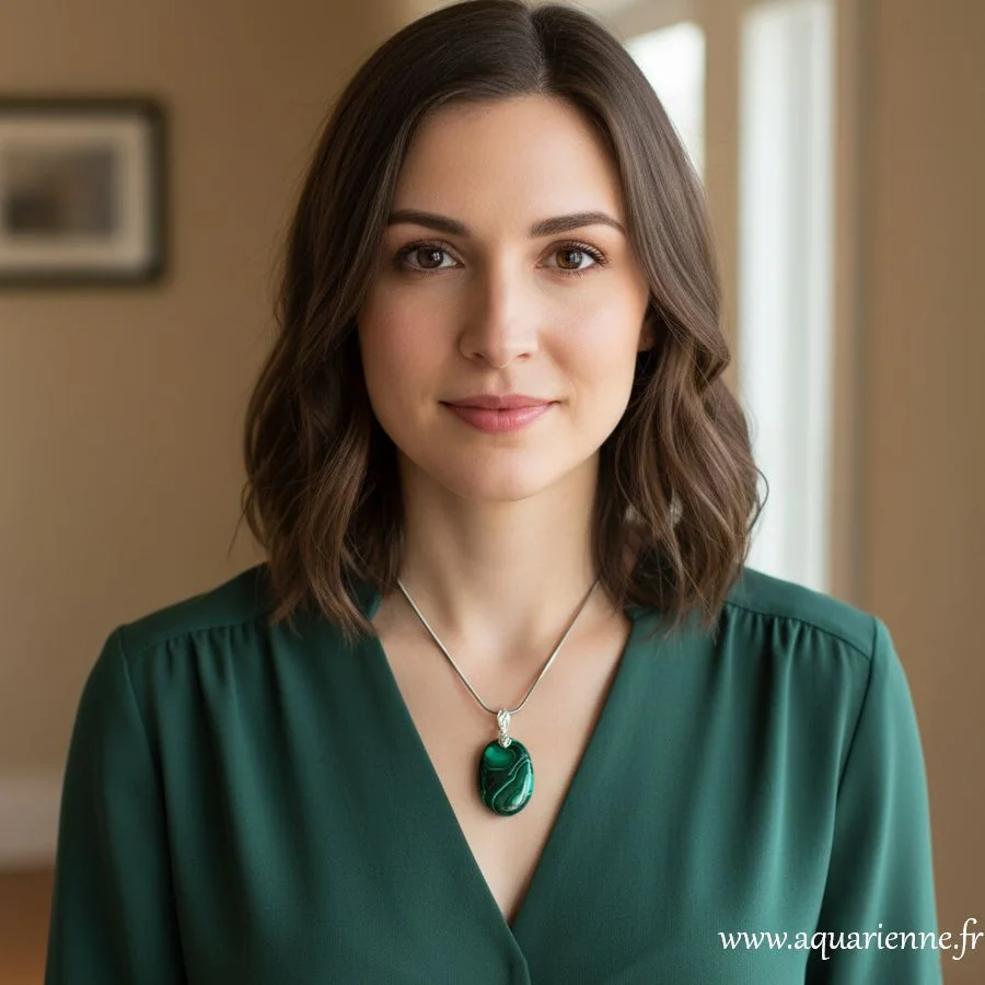 En pendentif, la Malachite se place naturellement près du cœur, amplifiant son énergie d’ouverture, de réconfort et d’alignement émotionnel.