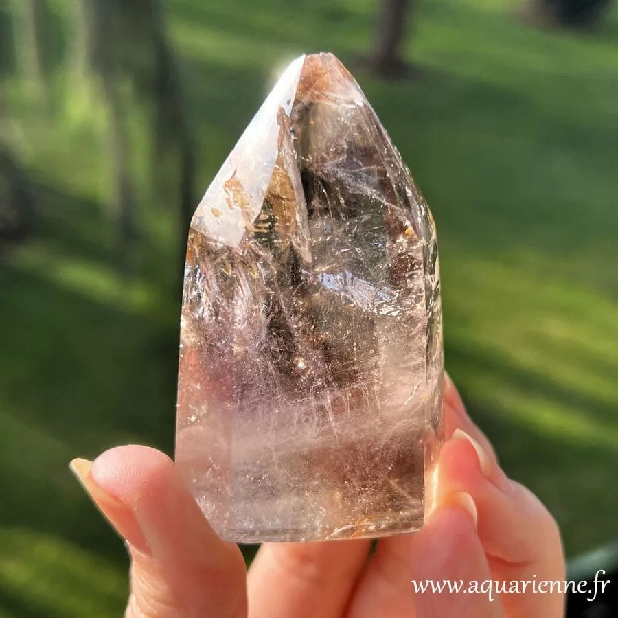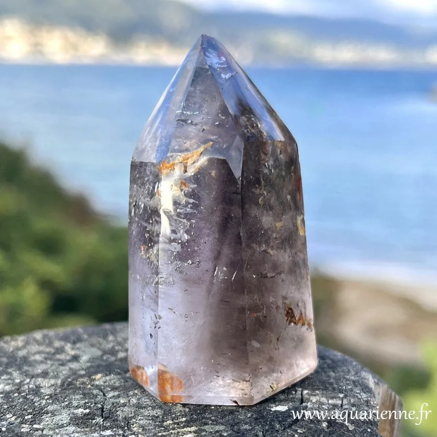 Cette alliance minérale permet un travail de vibratoire et réalignement profond. Le Quartz Fumé assure un ancrage stable, tandis que l’Améthyste purifie les plans subtils. La présence du fantôme évoque la mémoire cellulaire et le dépassement des étapes de vie, elle favorise une croissance intérieure sereine. Les inclusions ferrugineuses apportent, quant à elles, la vitalité nécessaire pour ancrer ses aspirations dans la réalité.